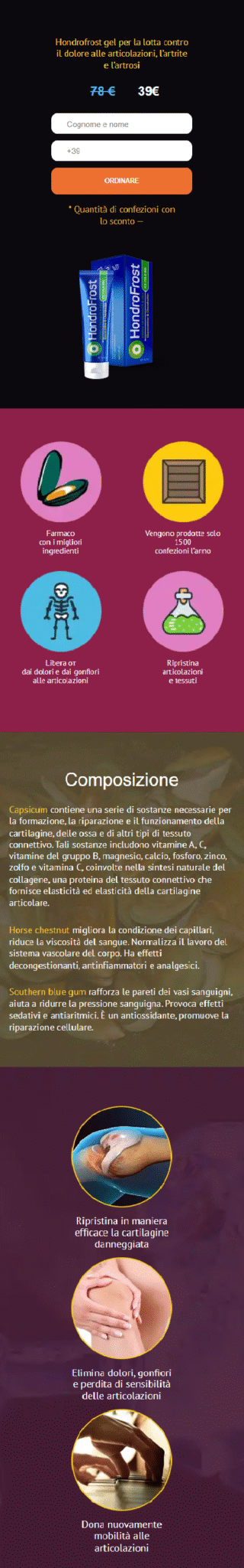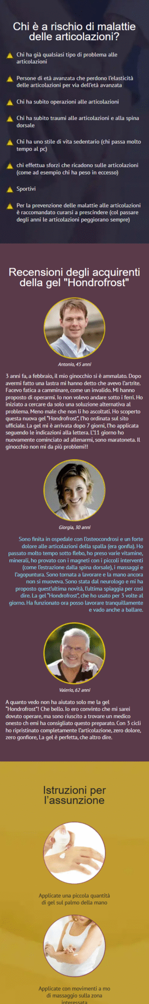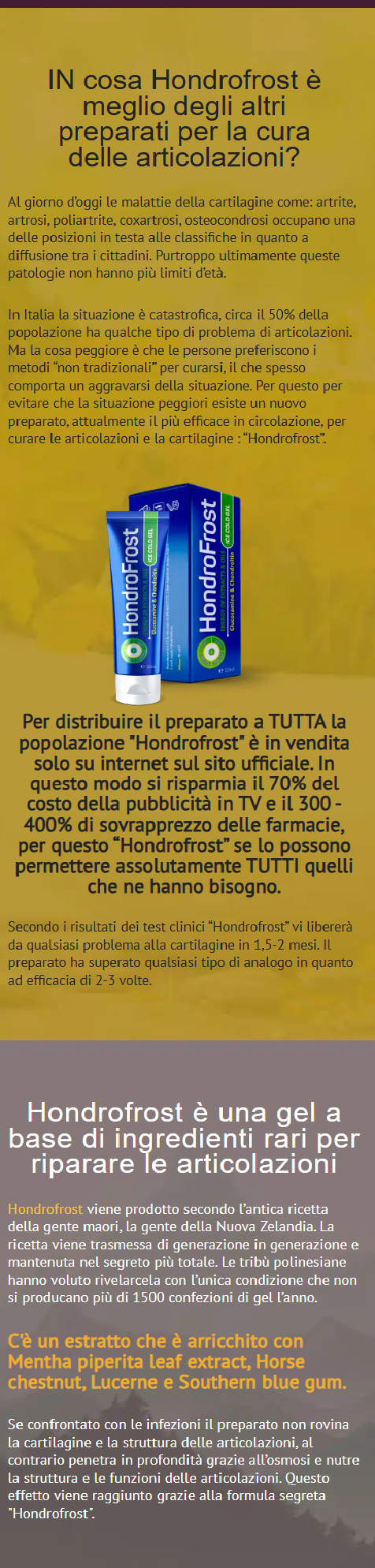 HondroFrost è diventato uno dei prodotti più ricercati in Italia da chi soffre di dolori articolari persistenti. Ginocchia, schiena, anche e spalle sono tra le zone più colpite, soprattutto dopo i 40 anni o in chi ha uno stile di vita attivo.Molte persone convivono ogni giorno con rigidità, infiammazione e limitazioni nei movimenti, spesso accettando il dolore come qualcosa di normale. Tuttavia, HondroFrost propone un approccio diverso, mirato a offrire sollievo rapido e progressivo.Il prodotto viene presentato come una soluzione pratica, facile da usare e adatta all’uso quotidiano. Secondo le informazioni ufficiali, la sua formula è pensata per agire direttamente sulle articolazioni, favorendo comfort e mobilità.Chi ha già provato HondroFrost riferisce una sensazione di freschezza immediata seguita da un rilassamento dell’area trattata. Questo effetto è uno dei motivi per cui il prodotto ha attirato l’attenzione di molti consumatori italiani. Negli ultimi mesi, HondroFrost è diventato oggetto di numerose discussioni online. Forum, commenti e testimonianze mostrano un crescente interesse da parte di persone che cercano alternative semplici ai soliti metodi.Uno dei motivi principali è la comodità. HondroFrost non richiede procedure complicate e può essere integrato facilmente nella routine quotidiana. Questo lo rende particolarmente interessante per chi non ha tempo o non vuole ricorrere a soluzioni invasive.Inoltre, il prodotto viene apprezzato perché non promette miracoli irrealistici, ma punta a un miglioramento graduale del benessere articolare. Questo approccio realistico aumenta la fiducia di chi lo valuta prima dell’acquisto.Molti utenti sottolineano che la costanza nell’uso fa la differenza e che i benefici diventano più evidenti con il passare dei giorni.HondroFrost è indicato per uomini e donne che soffrono di fastidi articolari, indipendentemente dall’età. È spesso scelto da persone attive, lavoratori che passano molte ore in piedi o seduti, e da chi pratica sport.Anche chi ha dolori dovuti all’età trova in HondroFrost un valido alleato per migliorare la qualità della vita quotidiana. La possibilità di muoversi con maggiore libertà è un fattore determinante per il benessere generaleIl prodotto viene utilizzato anche da chi ha già provato altre soluzioni senza risultati soddisfacenti. In questi casi, HondroFrost rappresenta una nuova opportunità.La versatilità è uno dei suoi punti di forza, poiché può essere applicato su diverse zone del corpo secondo necessità.Secondo le informazioni disponibili, HondroFrost agisce localmente, offrendo un’azione mirata direttamente sull’area interessata. Questo consente di concentrare l’effetto dove serve di più.L’effetto rinfrescante iniziale contribuisce a dare sollievo immediato, mentre l’uso regolare favorisce una sensazione di maggiore elasticità articolare. Questo è particolarmente apprezzato al mattino o dopo una giornata intensa.Molti utenti riportano una riduzione della rigidità e una maggiore facilità nei movimenti quotidiani, come camminare, salire le scale o piegarsi.La semplicità di applicazione rende HondroFrost una soluzione pratica anche per chi non ha familiarità con prodotti specifici per le articolazioni.Le opinioni su HondroFrost sono in gran parte positive. Numerosi clienti italiani raccontano di aver ritrovato comfort e libertà di movimento dopo poche settimane di utilizzo.Alcuni sottolineano come il prodotto li abbia aiutati a riprendere attività che avevano abbandonato a causa del dolore. Altri apprezzano soprattutto la rapidità con cui si percepisce il sollievo.Le testimonianze mostrano un elemento comune: la soddisfazione per una soluzione semplice ma efficace. Questo rafforza l’idea che HondroFrost risponda a un bisogno reale.Naturalmente, i risultati possono variare da persona a persona, ma il feedback generale è incoraggiante.Il dolore articolare non influisce solo sul corpo, ma anche sull’umore e sulla vita sociale. HondroFrost viene spesso citato come un aiuto concreto per migliorare la quotidianità.Riuscire a muoversi senza dolore significa tornare a fare passeggiate, viaggi e attività con maggiore serenità. Questo aspetto è fondamentale per il benessere complessivo.Molti utenti affermano di sentirsi più attivi e meno limitati, il che contribuisce a una maggiore fiducia in se stessi.Investire nella salute delle articolazioni è visto da molti come un passo importante verso uno stile di vita più equilibrato.Rispetto ad altri prodotti simili, HondroFrost si distingue per la sua formula e per l’approccio orientato al comfort immediato. Non si tratta solo di mascherare il dolore, ma di favorire una sensazione di benessere duraturo.La facilità d’uso e la possibilità di applicarlo direttamente sulle zone interessate lo rendono pratico e accessibile a tutti.Inoltre, il fatto che sia disponibile online consente di ordinarlo comodamente da casa, evitando code o spostamenti inutili.Questi elementi contribuiscono a rendere HondroFrost una scelta sempre più popolare in Italia.Per ottenere i migliori risultati, è importante seguire le indicazioni fornite. L’applicazione regolare è fondamentale per favorire benefici progressivi.Molti utenti consigliano di applicare il prodotto sulle zone interessate con un leggero massaggio, permettendo un migliore assorbimento.L’uso costante, giorno dopo giorno, aiuta a mantenere una sensazione di sollievo e comfort.Integrare HondroFrost nella propria routine quotidiana è semplice e non richiede particolari accorgimenti.HondroFrost è disponibile esclusivamente online tramite il sito ufficiale. Questo garantisce l’autenticità del prodotto e l’accesso alle eventuali promozioni.Acquistare dal sito ufficiale permette inoltre di ricevere assistenza dedicata e informazioni aggiornate sul prodotto.Molti consumatori preferiscono questa modalità perché offre maggiore sicurezza rispetto a canali non ufficial